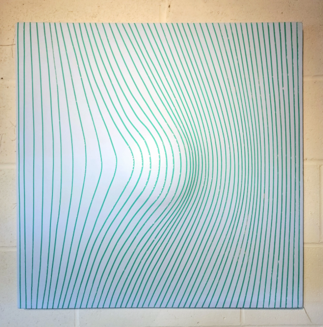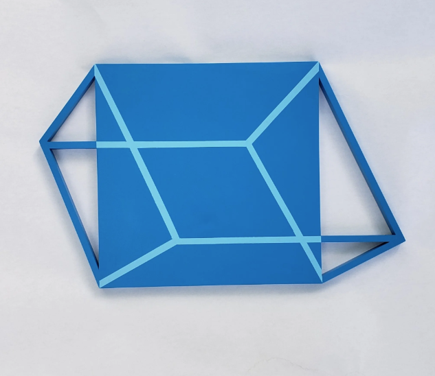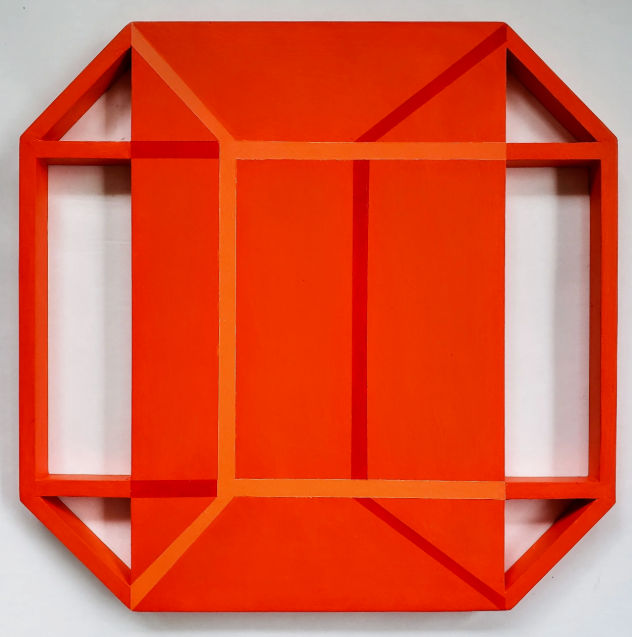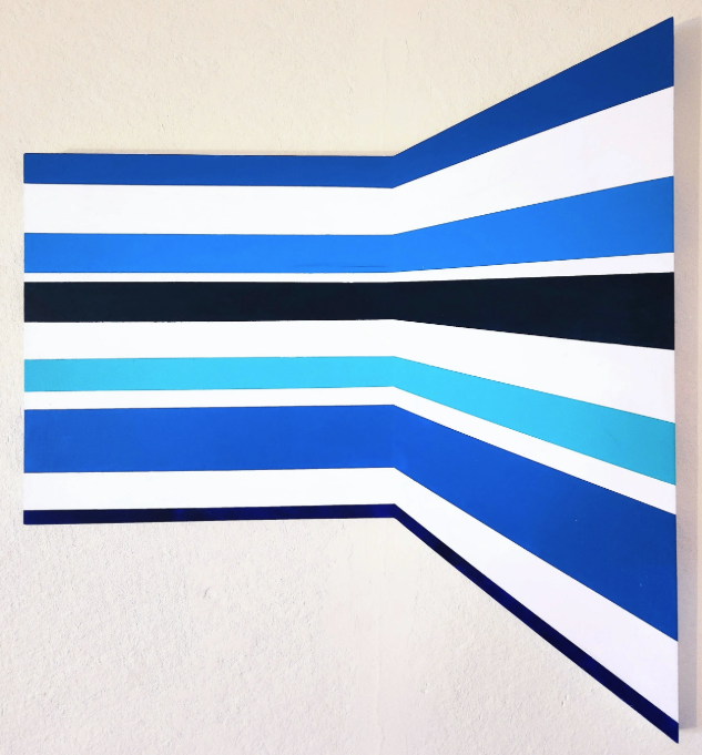 “Shaped canvases. Minimalist. Color-field influenced. But it’s really about exploring the space between dimensions—between what we think we see and what’s physically present.”