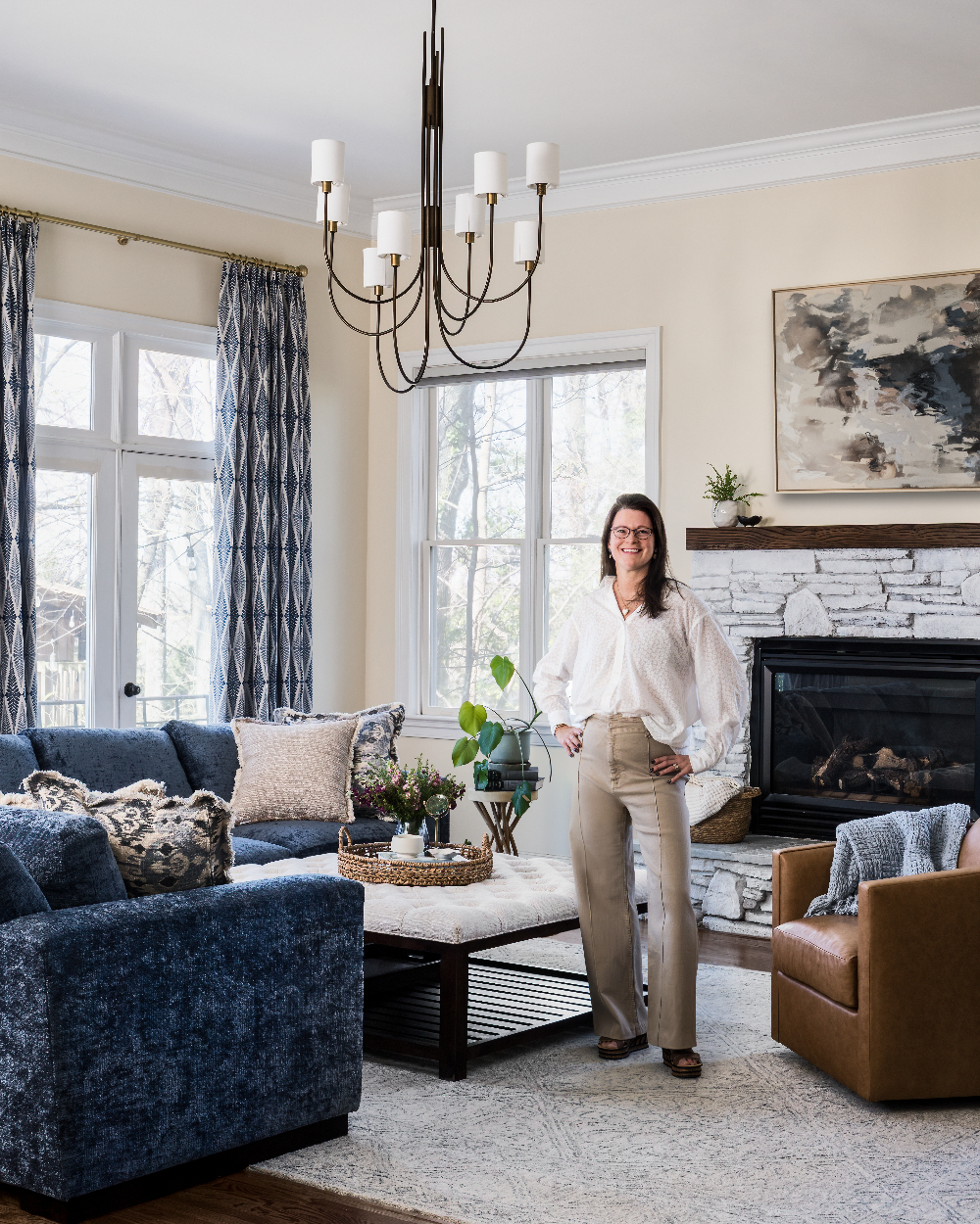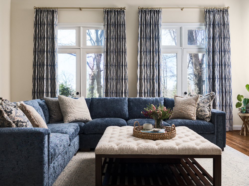 We reimagined the room with a serene blue palette, using the rug, custom window treatments, and tailored sectional to create a cohesive flow that’s as elegant as it is inviting. A generously sized ottoman now anchors the seating area, giving everyone a place to kick back and relax for movie nights or lazy weekends.