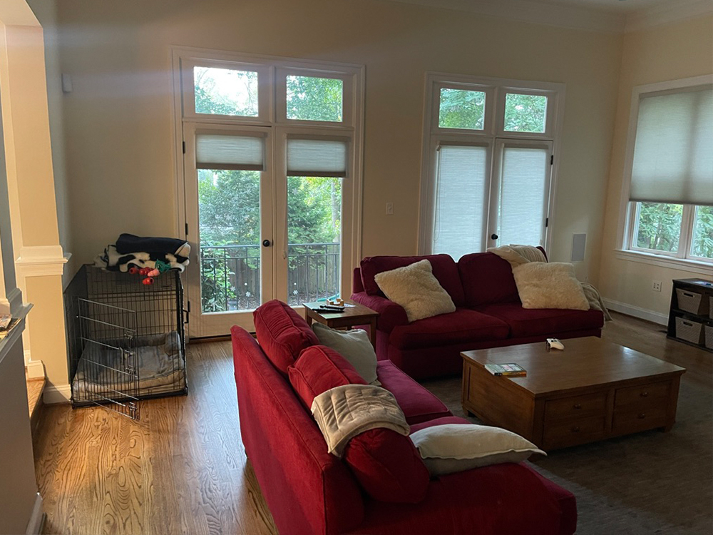 This family room had great bones-soaring windows, a central fireplace, and generous square footage-but it lacked cohesion and comfort. The furniture felt too small for the scale of the room, the windows were bare, and the heavy stone fireplace didn’t reflect the clients’ taste or style. It was a space that simply didn’t feel like home.