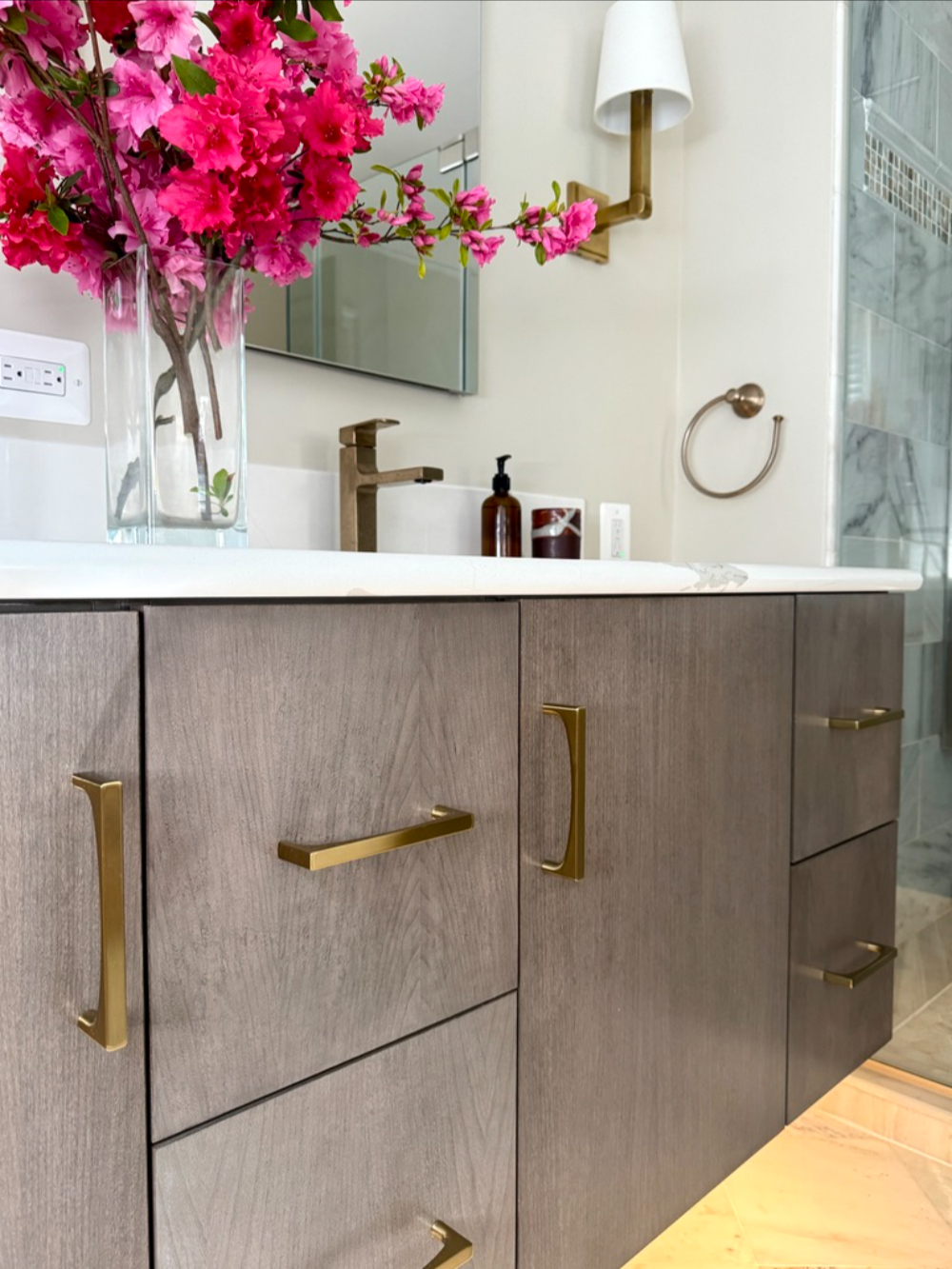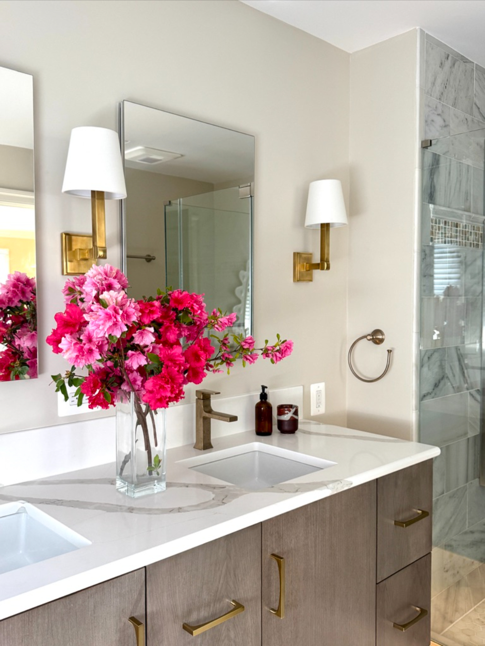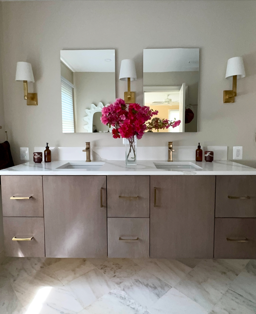 To elevate the everyday routine, we upgraded the lighting with tailored brass sconces and paired them with clean-lined mirrors for a balanced, symmetrical look that feels both modern and timeless. The result is a primary bathroom that feels lighter, more organized, and quietly luxurious—proof that you can achieve a major transformation while keeping key tile elements in place.
