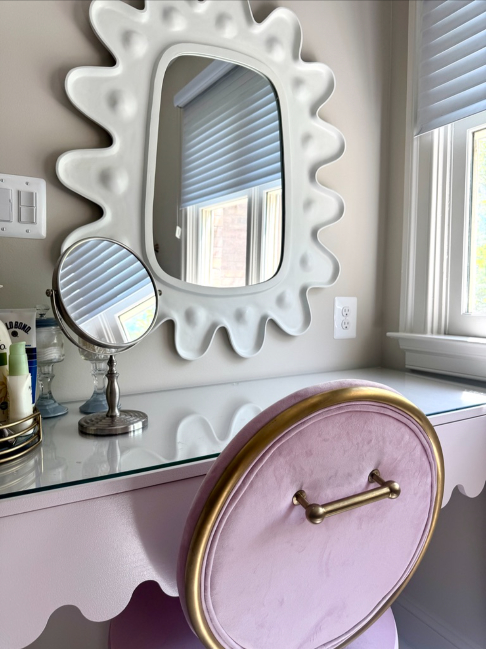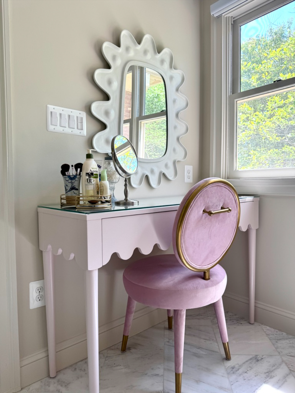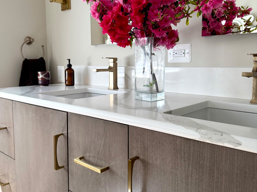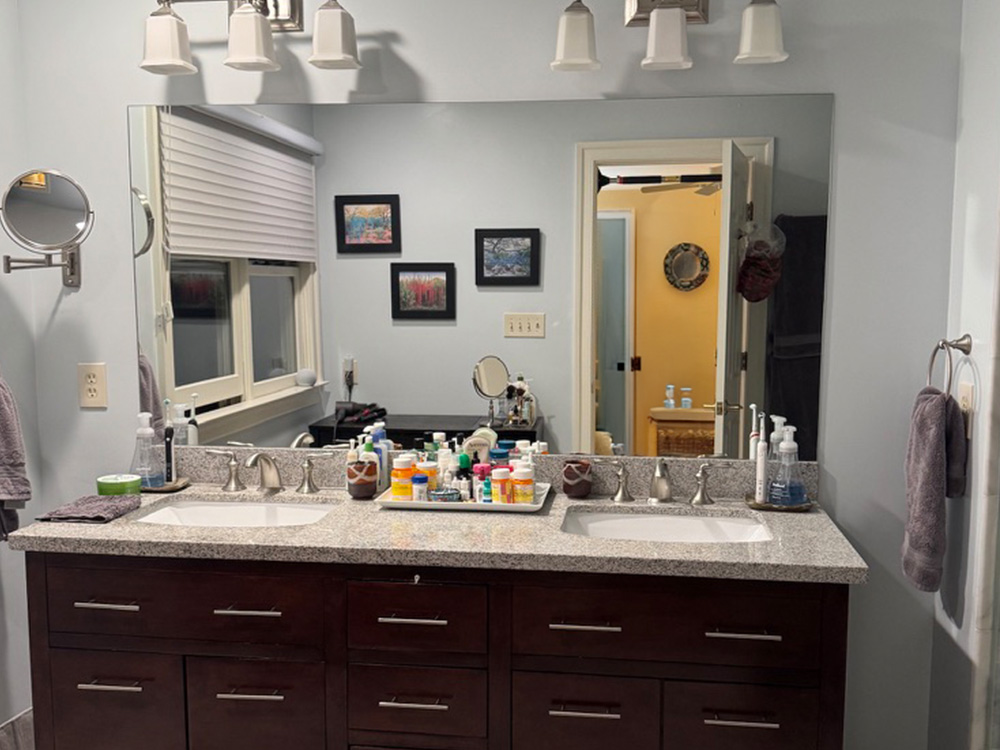 To elevate the everyday routine, we upgraded the lighting with tailored brass sconces and paired them with clean-lined mirrors for a balanced, symmetrical look that feels both modern and timeless. The result is a primary bathroom that feels lighter, more organized, and quietly luxurious—proof that you can achieve a major transformation while keeping key tile elements in place.